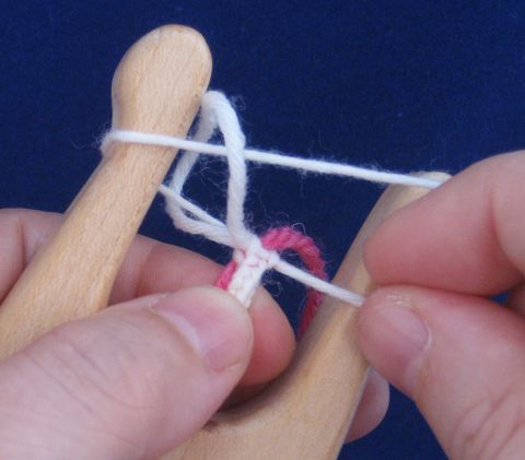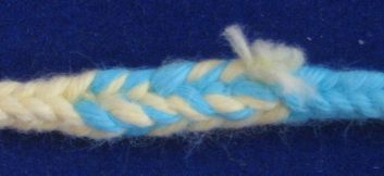 Aluksi tehdään nyöriä alkuperäisellä langalla. Sitten toinen lanka tuodaan nyörin päälle ja kerältä juokseva lanka laitetaan sen päälle.