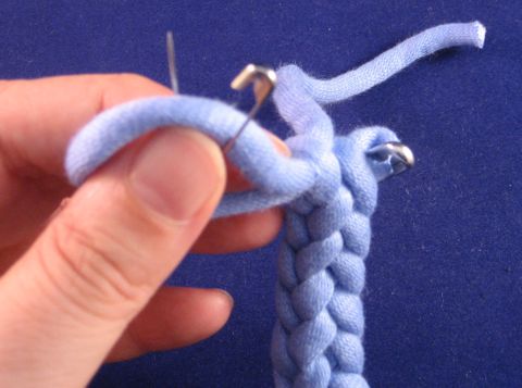 On kuitenkin olemassa toinen tapa, tosin se ei sovellu hyvin ohuille nyöreille: nyörin voi päätellä katkaisukohdasta. Tämän voi tehdä katkaisukohdan molemmille puoliskoille. Tarvitset muutaman hakaneulan tai avattavan neulemerkin sekä parsinneulan tai hyvin ohuen sukkapuikon tai paksun nuppineulan. Jos katkaiset määrämittaan, jätä katkaisukohtaan 5-10 cm varaa eli jos nyörin pitää olla metrin pituinen, katkaise 1,05-1,10 metrin kohdalta.