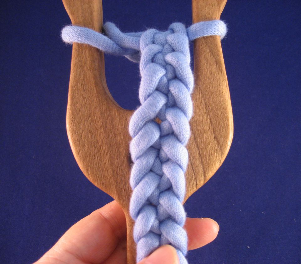 Aluksi tehdään nyöriä alkuperäisellä langalla. Sitten toinen lanka tuodaan nyörin päälle ja kerältä juokseva lanka laitetaan sen päälle.